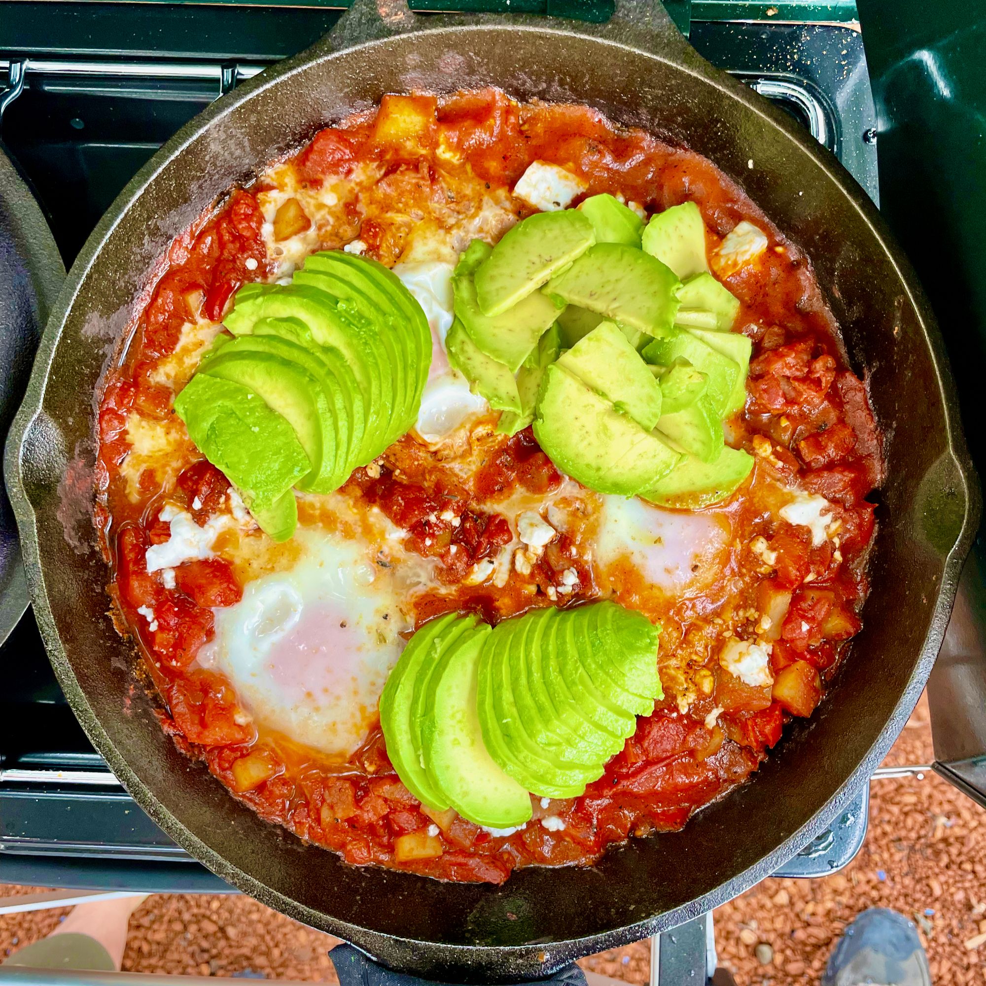 - Breakfast. Single-skillet shakshuka sitting atop hashed browns and topped with fresh avocado. I sprinkled mint and parsely atop the final dish.