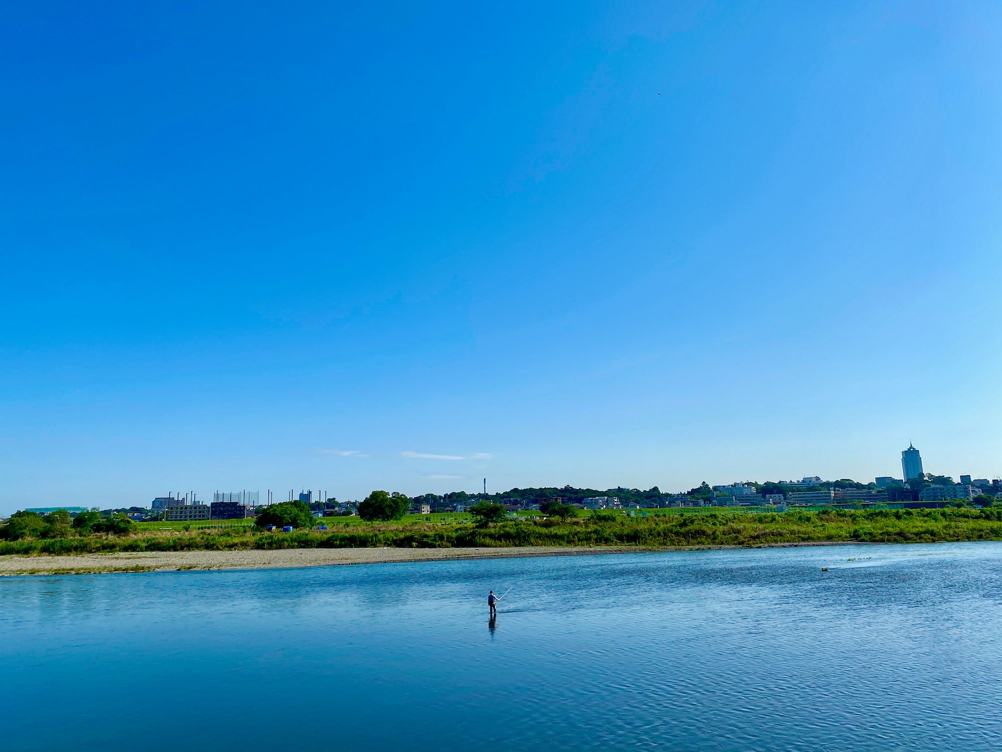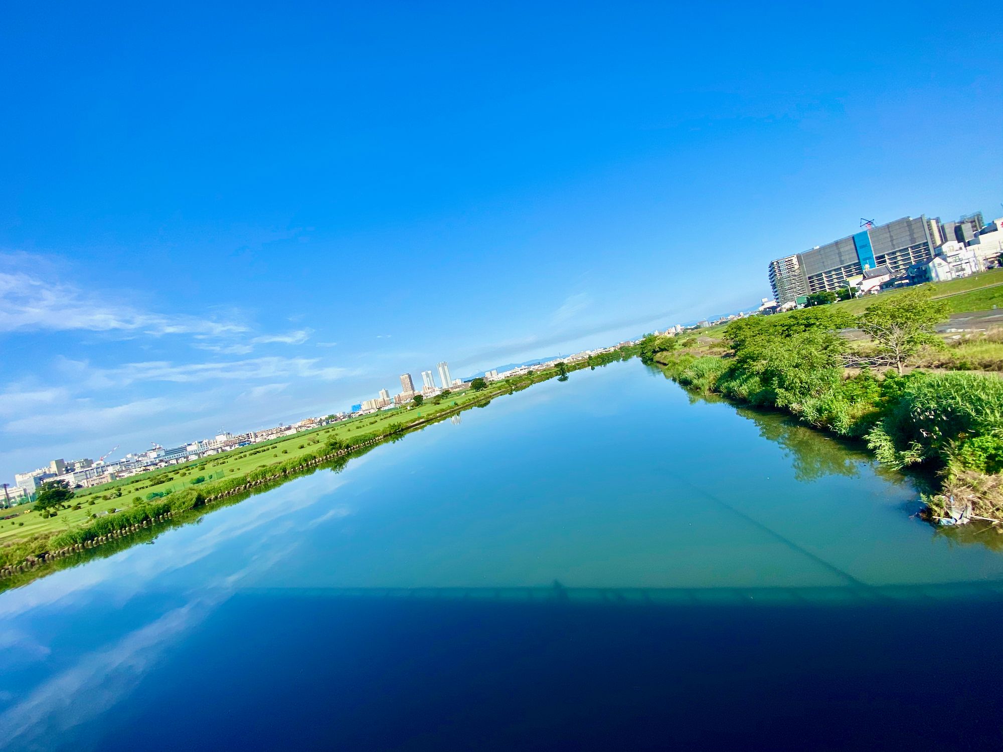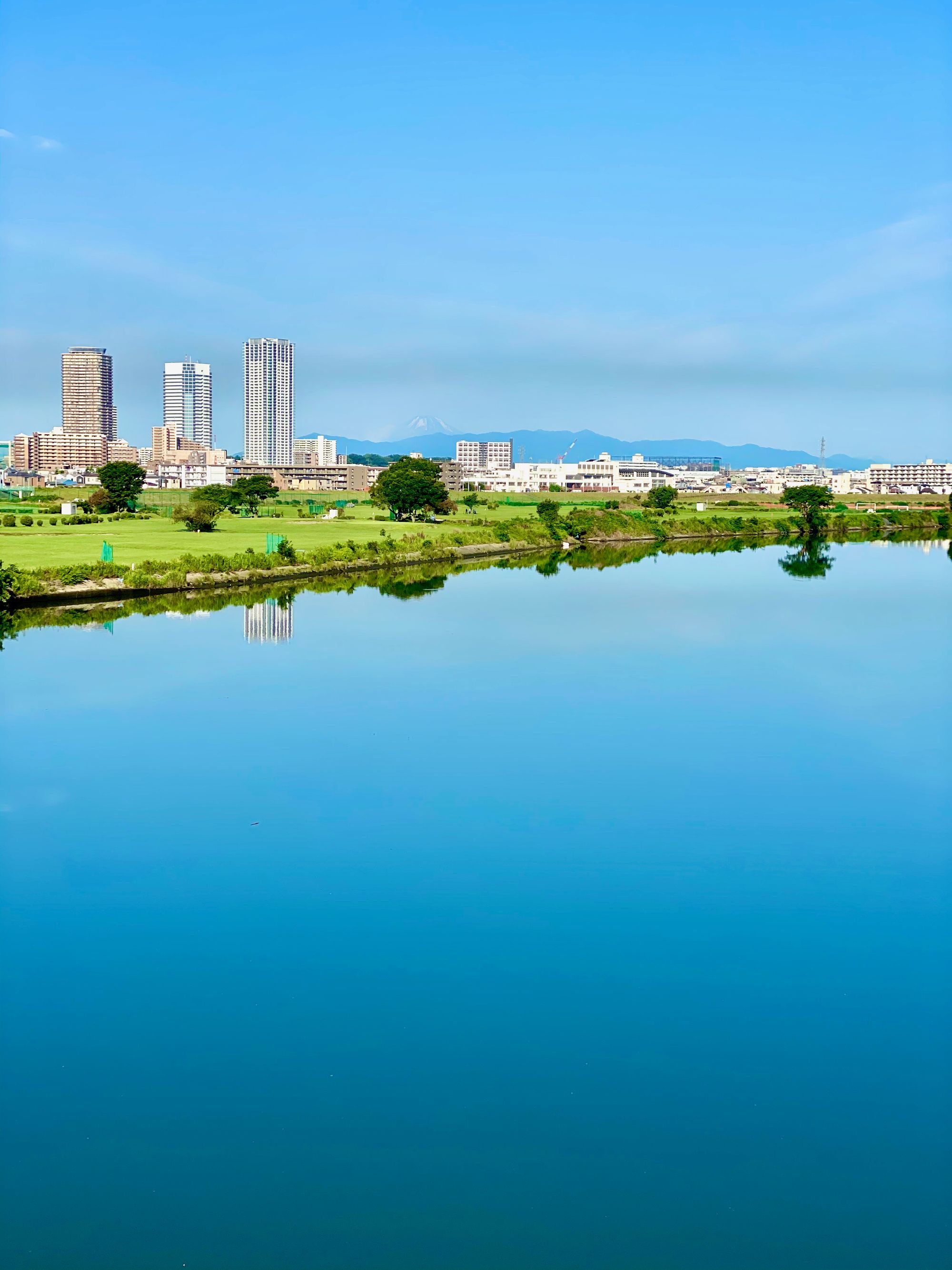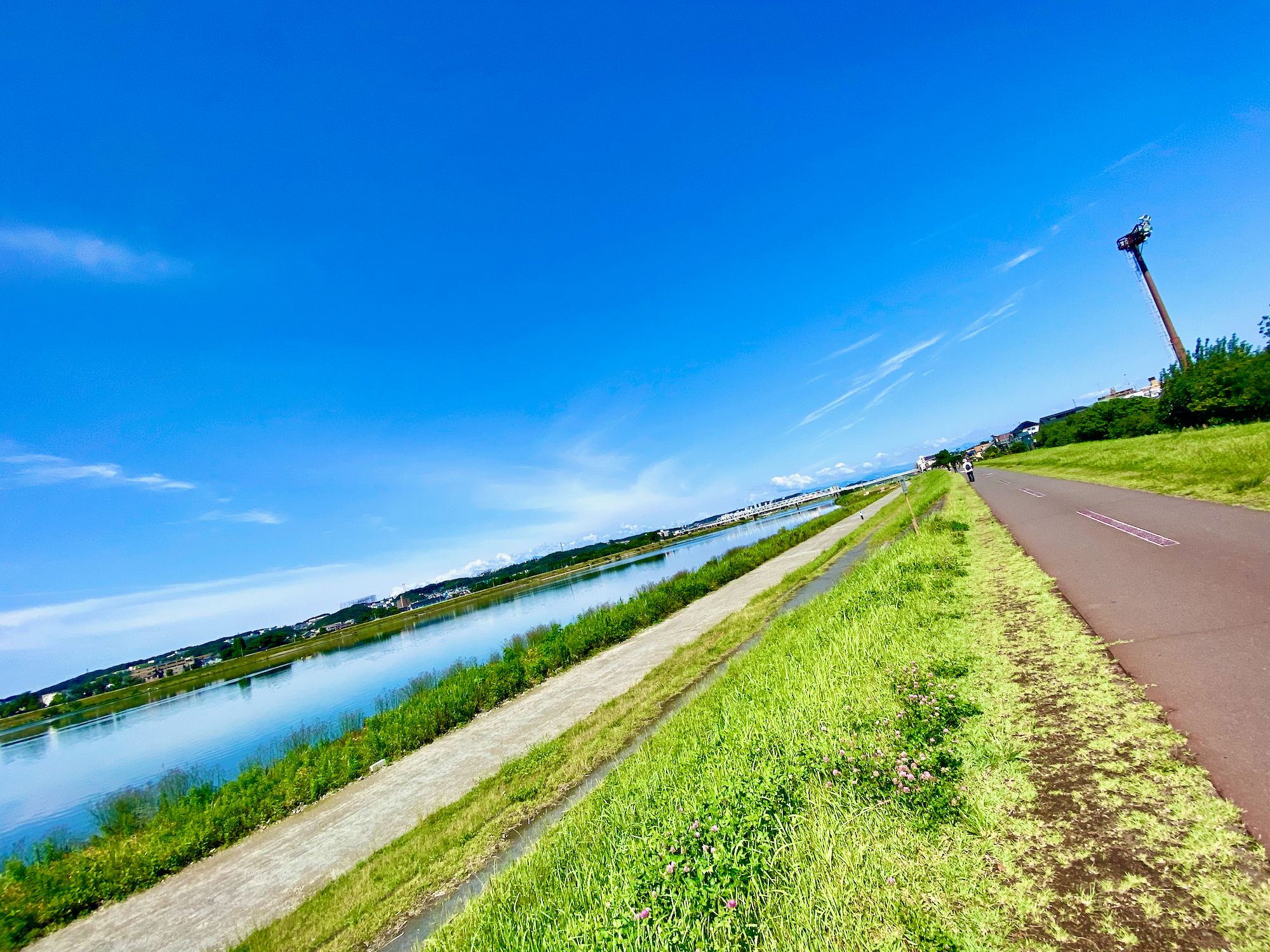 My route on this ride was to head downstream for a short bit before crossing the Tamagawa, and then heading upstream to my standard ending spot. I paused for a moment to hit the bathroom and hydrate, and then got back on the bike – at this point I was riding the Domane – and rode the 25k back home under the bright blue skies, next to the lovely warm blue water.