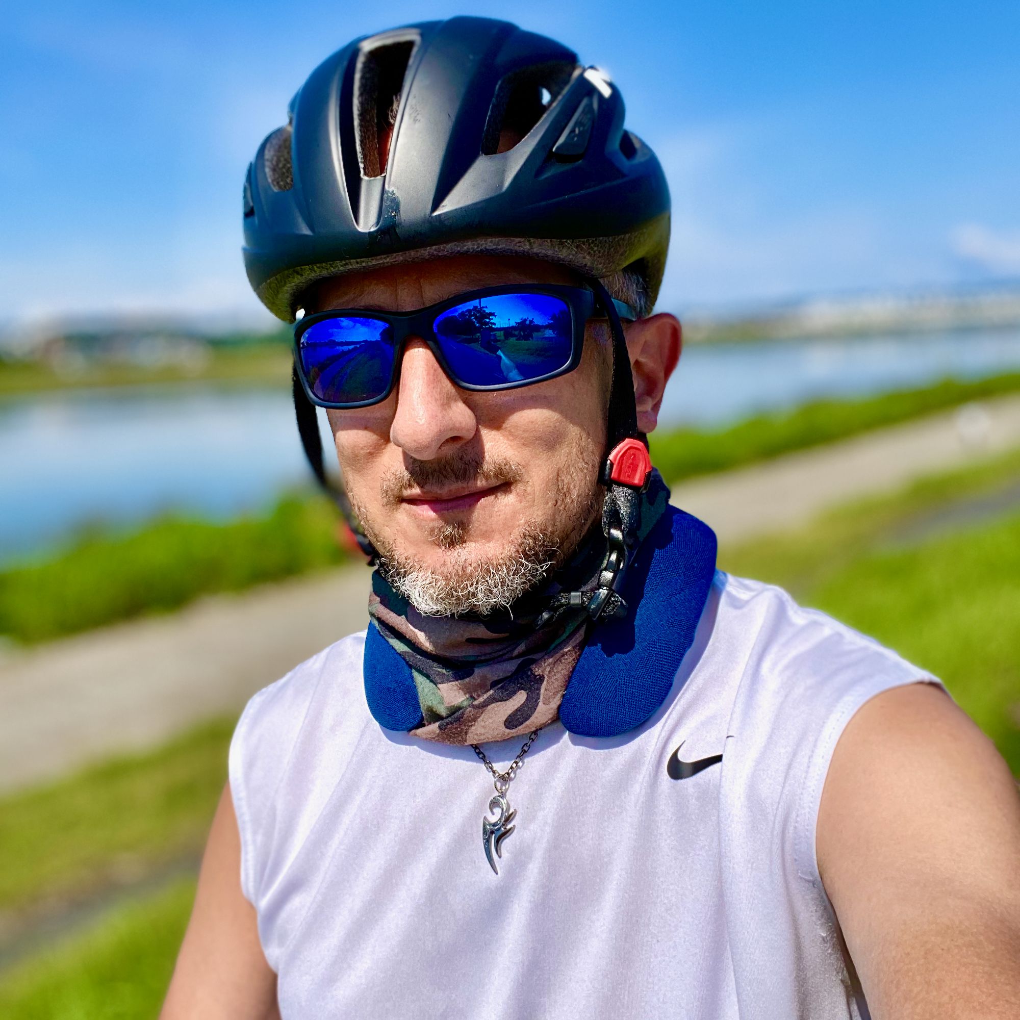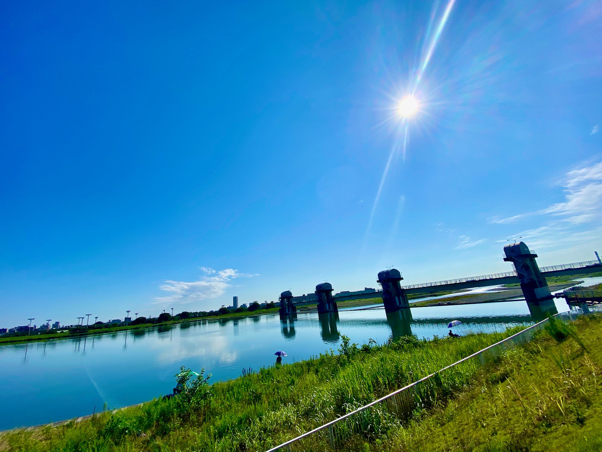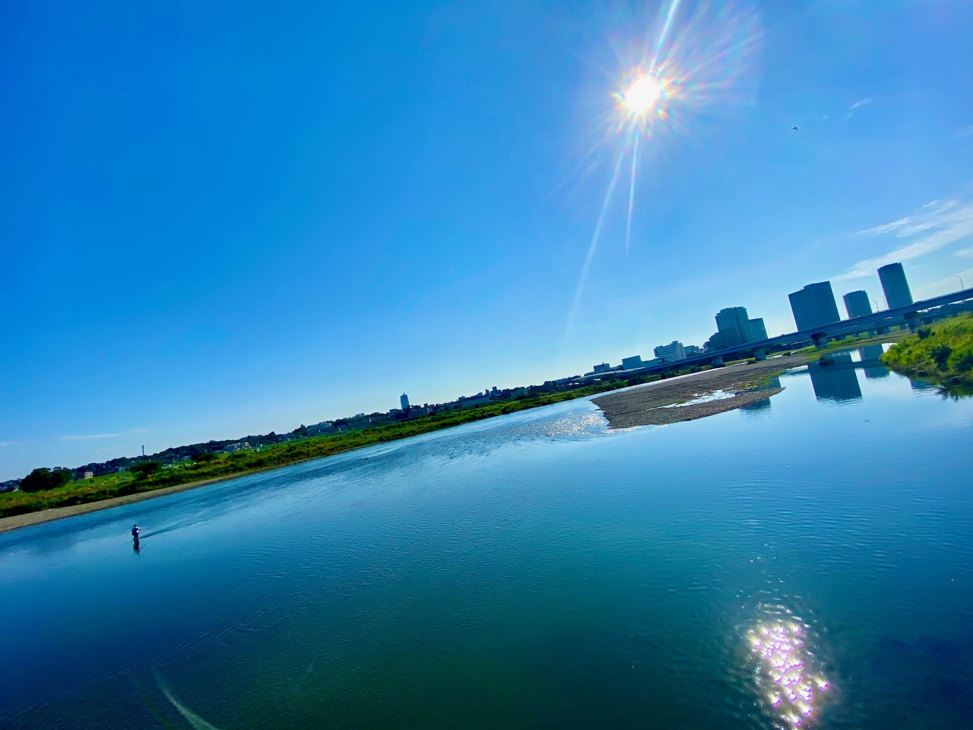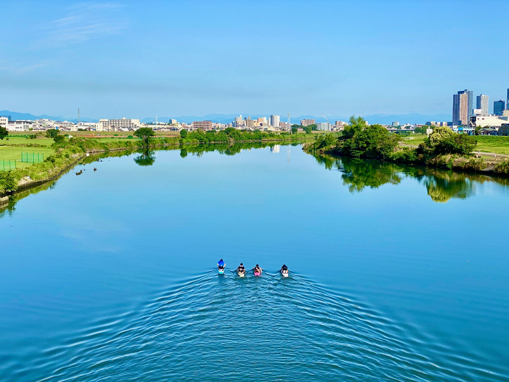 My route on this ride was to head downstream for a short bit before crossing the Tamagawa, and then heading upstream to my standard ending spot. I paused for a moment to hit the bathroom and hydrate, and then got back on the bike – at this point I was riding the Domane – and rode the 25k back home under the bright blue skies, next to the lovely warm blue water.